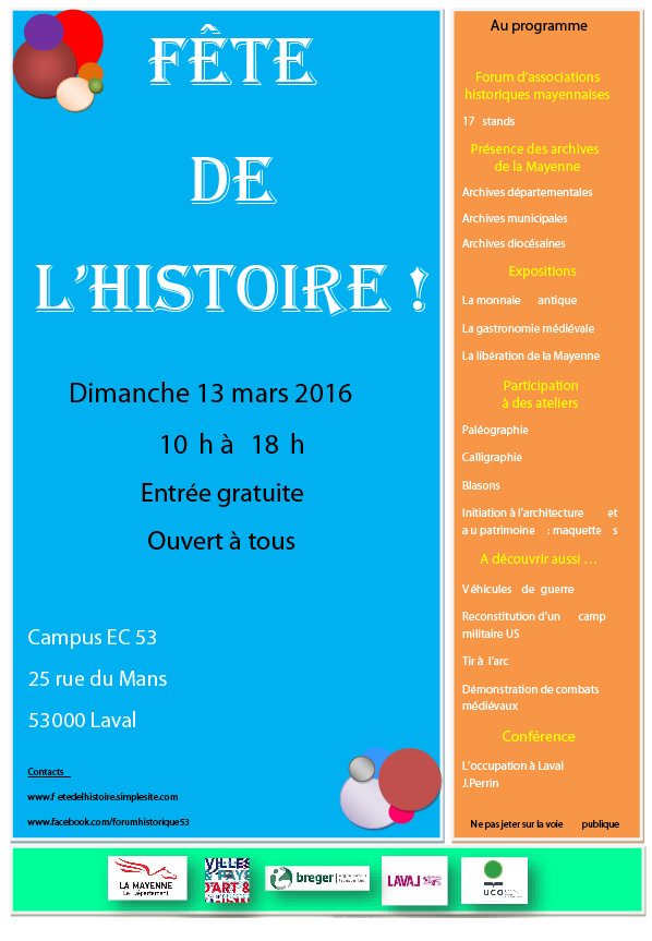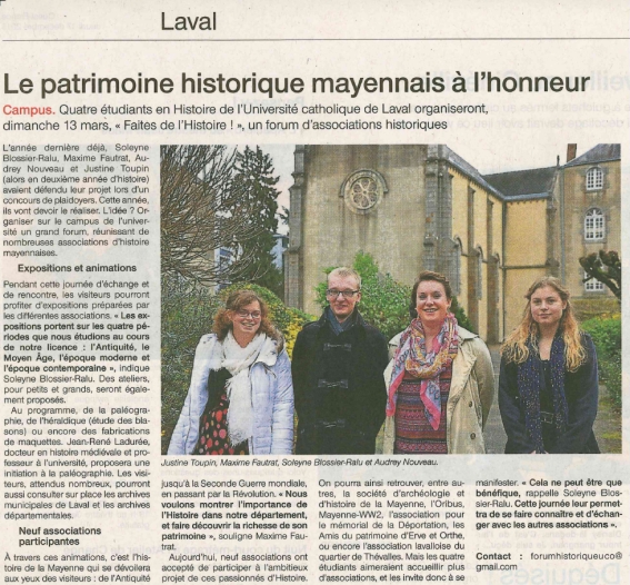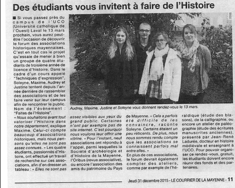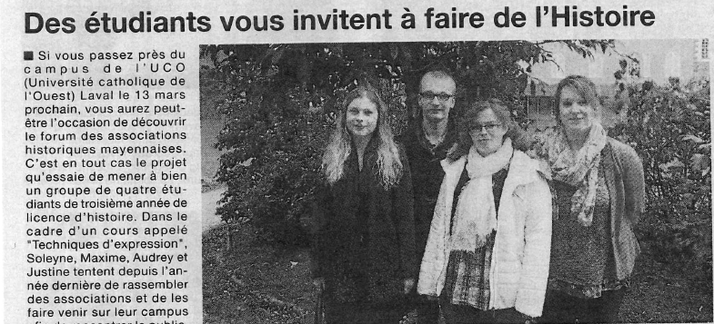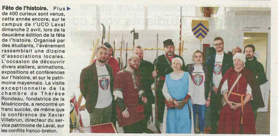 Article du Courrier de la Mayenne datant du jeudi 6 avril 2017 ............................................................................................ □ 2e édition de la Fête de l'Histoire Projet porté par les étudiants de deuxième année de licence d'histoire, la Fête de l'Histoire aura lieu le dimanche 2 avril 2017, de 10 h à 18 h, sur le campus EC 53. Au programme: un forum d’associations mayennaises d’histoire locale et de promotion du