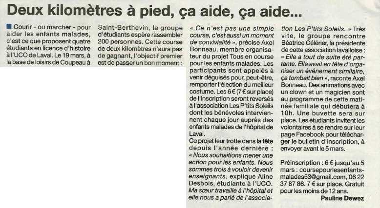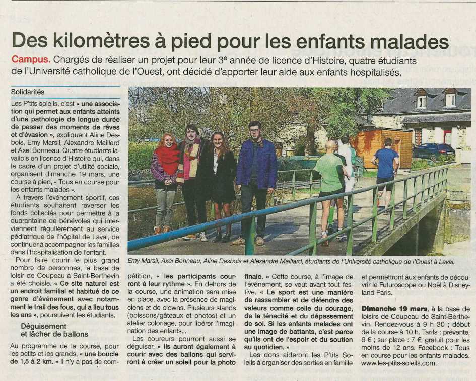 ............................................................................................. □ Tous en course pour les enfants malades C'est le nom du projet porté par 4 étudiants de troisième année de licence d'histoire. Aline, Emy, Alexandre et Axel se sont vus remettre une mention Coup de coeur lors du Prix de l'Initiative, organisé par le Crédit Agricole Anjou-Maine.