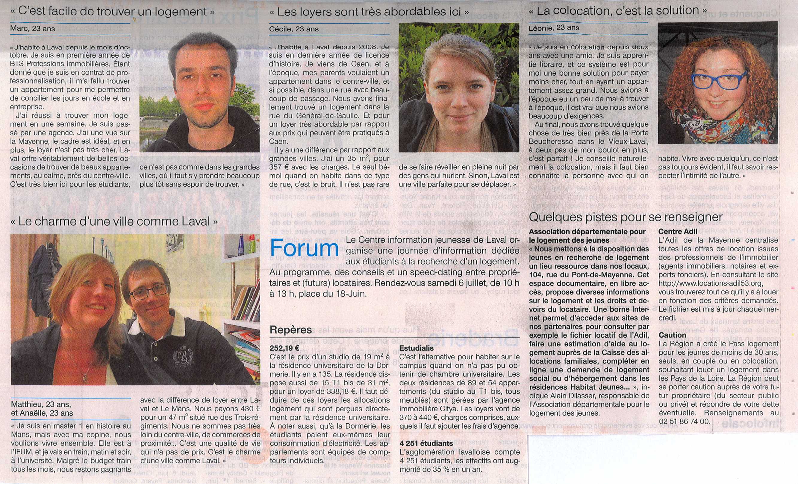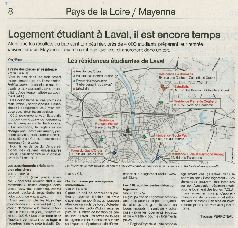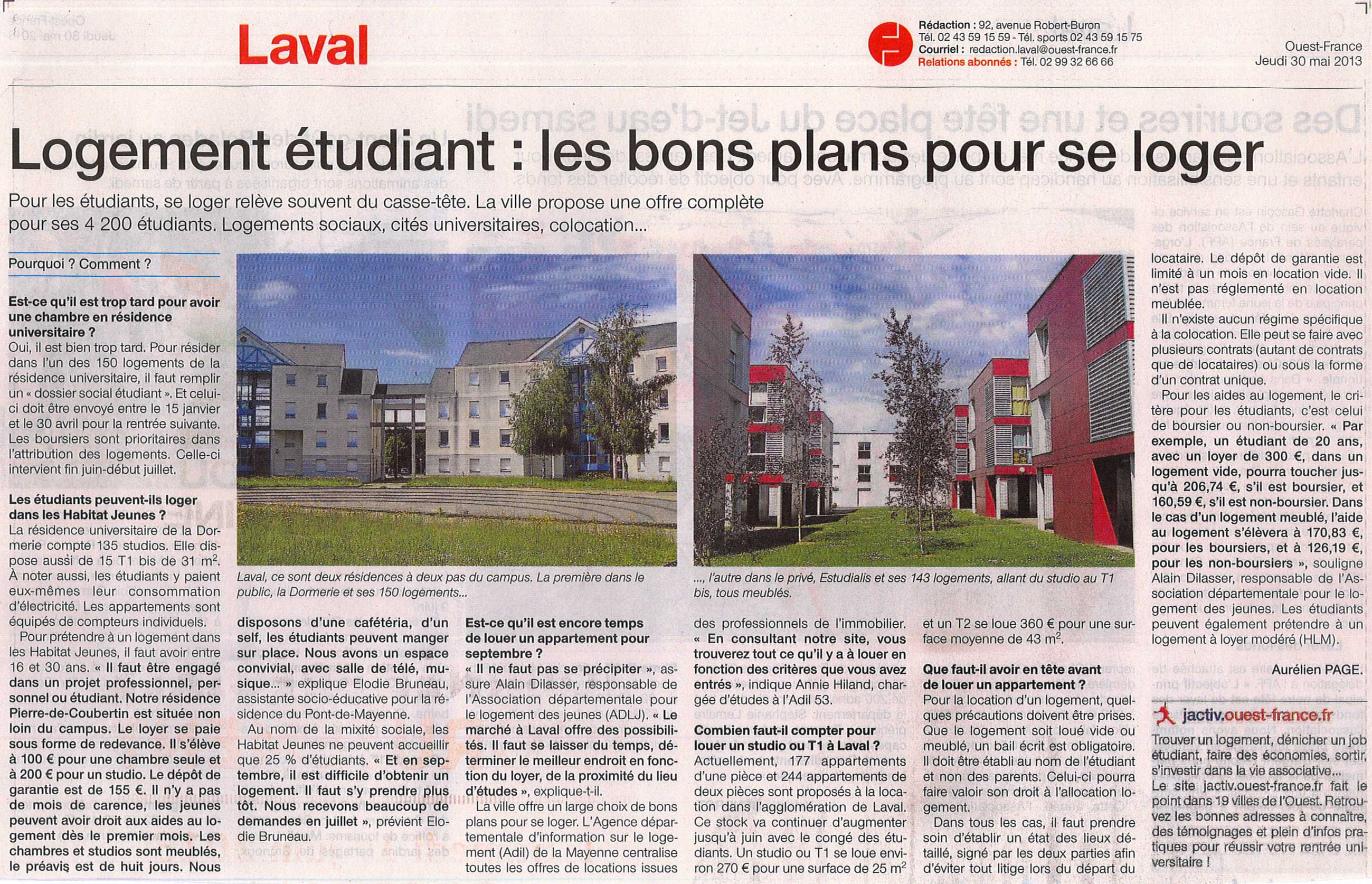 A LAVAL un logement étudiant moins couteux. Selon notre enquête logement annuelle la moitié de nos étudiants (hors ceux qui logent chez leurs parents) consacrent moins de 270 € par mois pour leurs loyers à Laval. Les moyennes des loyers estimées sur la base des statistiques 2010 de l'Observatoire Nationale de la Vie Etudainte sont de 430 € pour une ville de taille du Mans, 440 € pour Angers, 515 € pour Nantes et Rennes, 600 € en région Parisienne et 700 € pour Paris. Potentiellement le logement à Laval pour un étudiant revient à 2900 € de moins qu'à Rennes pour 12 mois. De plus, le logement est en général plus spacieux. Vous pouvez retrouver toutes les annonces de logement vacants à destination des étudiants à Laval sur le site www.lokaviz.fr A savoir : La Région des Pays de la Loire peut se porter caution pour votre logement (voir sur le site infos-jeunes.fr) 3 adresses utiles pour le logement à Laval : - l'ADLJ centralise les offres des professionnels : Association départementale pour le logement des jeunes - le CIJ centralise les offres de logements des particuliers : Centre Information Jeunesse de Laval - Foyers jeunes travailleurs Un article complet de Ouest France du 6 juillet 2017 sur les possibilités de logement étudiant à Laval Des solutions alternatives pour les formations en alternance Si l'entreprise qui vous accueille en alternance est située à Rennes ou au Mans, il est éventuellement préférable de ne pas prendre de logement supplémentaire à Laval et d'utiliser si possible le train (trajet jusqu'à Laval inférieur à 40 min, campus situé à 10 min à pied de la gare SNCF). Plus globalement si le nombre